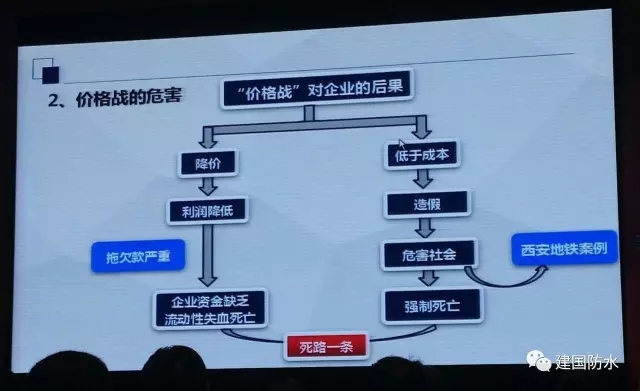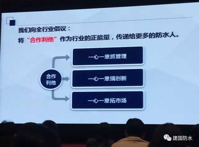 楊理事長主要就三個大家較為關(guān)注的行業(yè)問題進行分析講解,他著重強調(diào),企業(yè)之間打價格戰(zhàn)最終只能走向“滅亡”,號召企業(yè)要進行創(chuàng)新,依靠新產(chǎn)品、新技術(shù)、新管理、新組織、控制原材料等取得利潤,才能使企業(yè)在嚴(yán)峻的市場環(huán)境下穩(wěn)步前行。并且向全行業(yè)倡議,將“合作利他”作為行業(yè)的正能量,傳遞給更多的防水人。